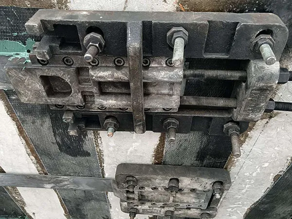 Во время монтажа трещины были сначала заделаны цементным раствором. Затем для точного выравнивания и натяжения системы были использованы гидравлические домкраты, обеспечивающие согласованную передачу нагрузки между углеродными пластинами и конструкцией.